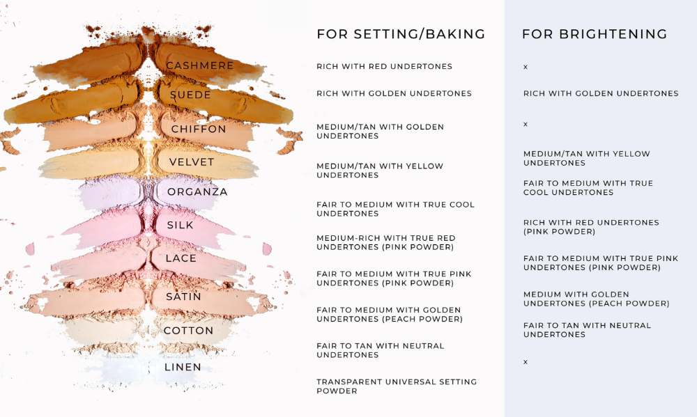 Use our handy guide below to choose your shade. All of our face powders are translucent, and leave a subtle veil of colour - which means they can be used for brightening, as well as setting.