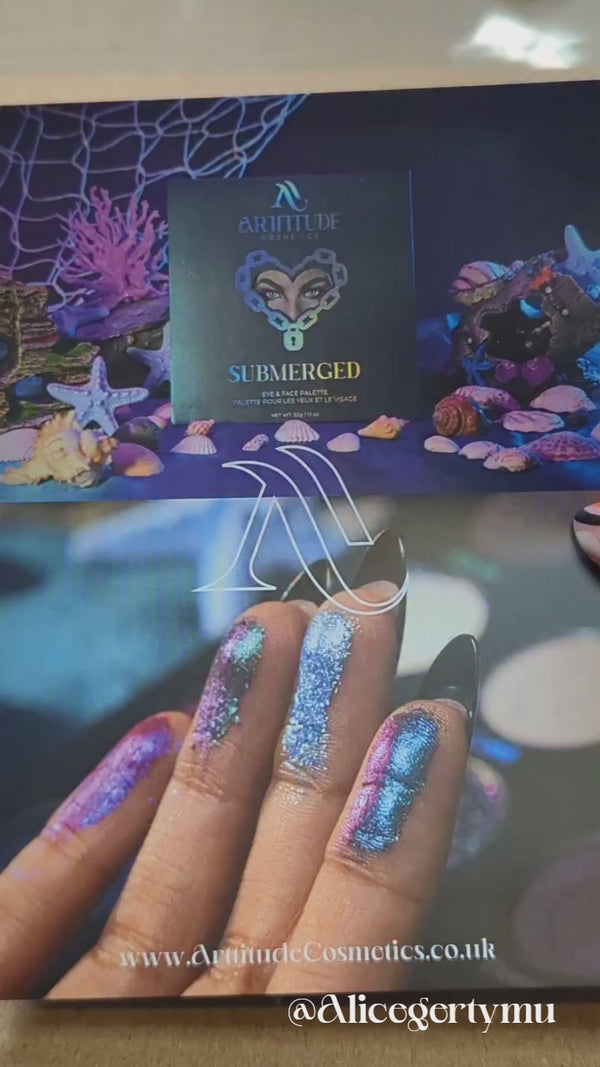 A fully magnetic 16-pan palette with 4 luxurious formulas — matte, holochrome, duochrome, and multichrome — Submerged captures the shifting magic of moonlit tides and deep ocean mystery. From the shimmer of Moonlight to the fathomless pull of Abyss, each shade moves like liquid light across your skin, allowing you to craft everything from soft, subtle glam to bold, siren eyes.