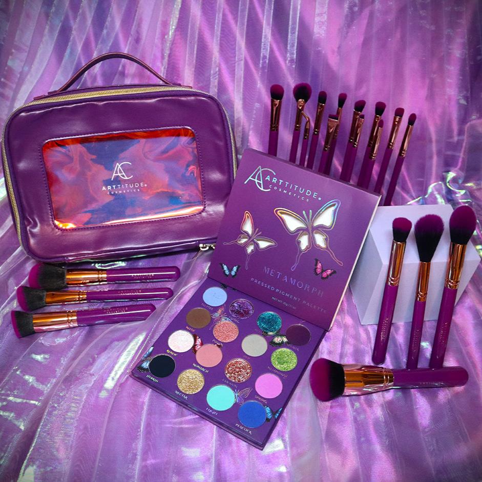 Save with our palette, and brush set bundle. Contains the 16 shade Metamorph palette, our 19 piece Complete Artistry PRO make-up brush set and purple holographic make-up bag!
