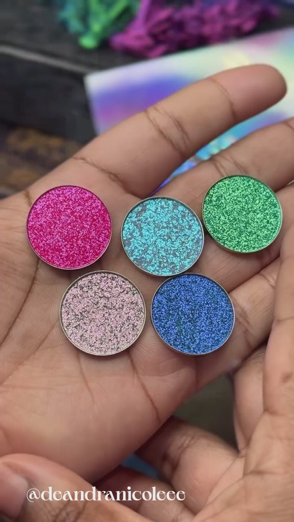 Whether worn alone for an effortless yet bold statement or layered over a base for extra intensity, these eyeshadows bring a futuristic, prismatic glow to any eye look. Perfect for those who love bold, unique, and high-impact makeup.